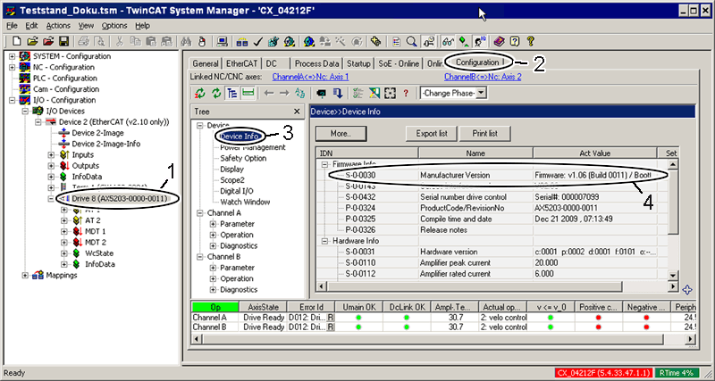 Der aktuelle Firmwarestand des AX5000 steht in der „IDN S-0-0030 – Manufacturer Version“ und kann folgendermaßen mit dem TCDriveManager angezeigt werden: Markieren Sie im TwinCAT System Manager den Servoverstärker (1), von dem Sie den Firmwarestand wissen möchten. Öffnen Sie den TCDriveManager (2) und klicken Sie auf „Device Info“ (3). Es öffnet sich ein Fenster und in der „IDN S-0-0030“ erscheint die aktuelle Firmwareversion (4).