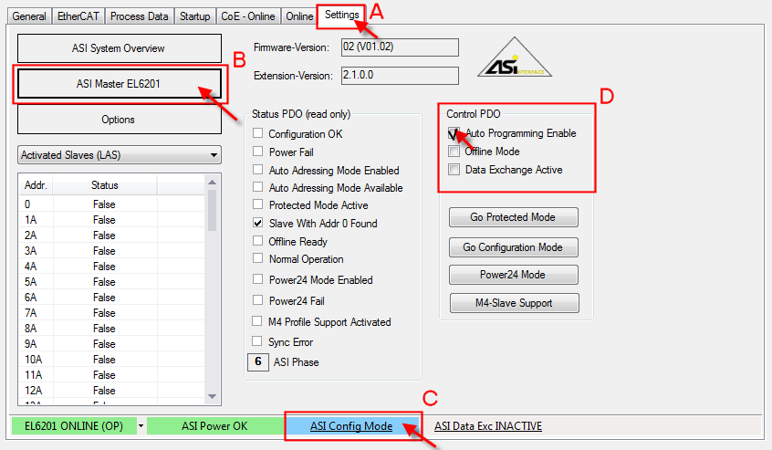 - Um den AS-I Datenaustausch zu ermöglichen, klicken Sie in das graue Feld "ASI Data Exc INACTIVE", das Feld wechselt auf grün "ASI Data Exc ACTIVE" (C).
