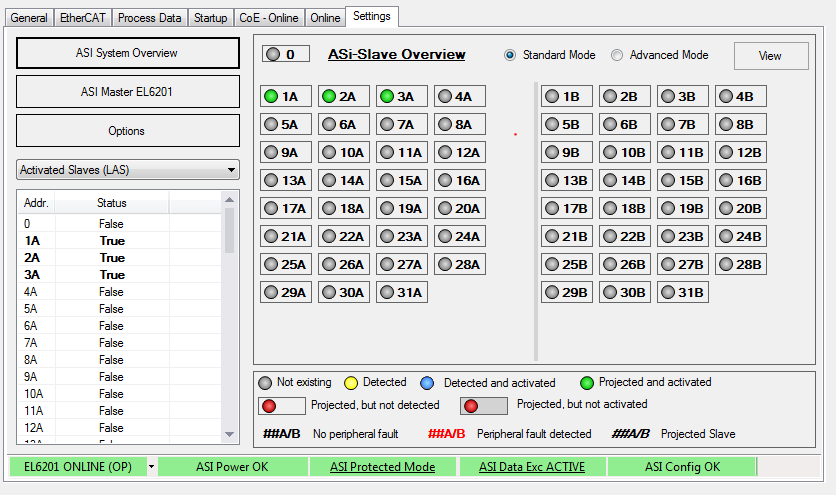 Klicken Sie auf den grauen Button „ASI Data Exc INACTIVE“, der auf grün „ASI Data Exc ACTIVE“ wechselt (siehe Abb.), die Anzeige der Slaves sollte sich dann stabil im Zustand „Detected and activated“ (blau) darstellen.