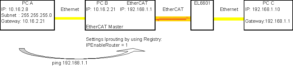 - Befindet sich der EtherCAT-Master in einem regulären und fehlerfreien Zustand (TwinCAT im "Config"/"FreeRun" oder "Run"-Modus), kann über die EL6601 der angeschlossene Ethernet-Teilnehmer mit der IP-Adresse 192.168.1.10 erreicht werden.
