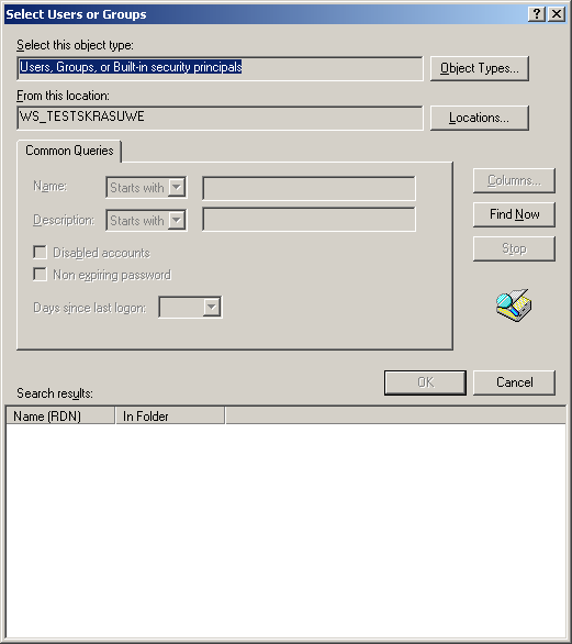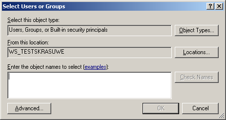 A filter on object types can be set to reduce the listing of all user names. The location states the machine name where the user account is stored, this can be the local workstation or the central domain controller machine. The edit box below the names can be typed in and verified afterwards by pressing the Check Names button.