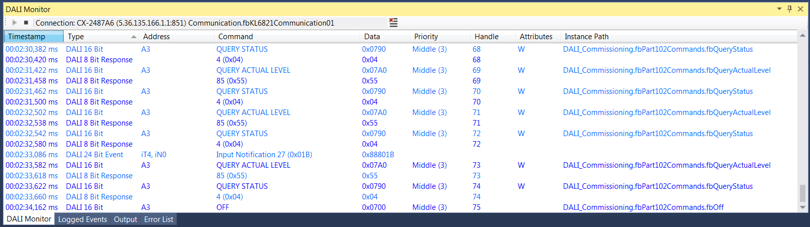 In der TwinCAT 3 Extension TwinCAT Communication Monitor ist ein Diagnose-Fenster enthalten, in dem die gesendeten DALI-Befehle und die DALI-Ereignisse der Tc3_DALI-Bibliothek angezeigt werden.