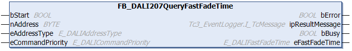 ![]() | Der Baustein versendet vor dem DALI-Befehl QUERY FAST FADE TIME den DALI-Befehl ENABLE DEVICE TYPE 6, so wie es für anwendungsbezogene Erweiterungsbefehle notwendig ist (siehe auch FB_DALI102EnableDeviceType). |