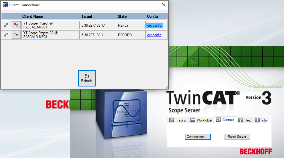 Wechseln Sie im Scope Server UI in den Tab Connect und klicken dort den Button Connections. Anschließend bekommen Sie eine Übersicht der verfügbaren Konfigurationen und ihren Status angezeigt.