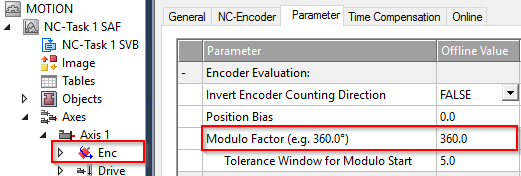 - Wird eine PTP-Achse verwendet, gilt der Modulo Factor des Achs-Encoders, Details in den Hinweisen der Modulo Positionierung einer PTP Achse.