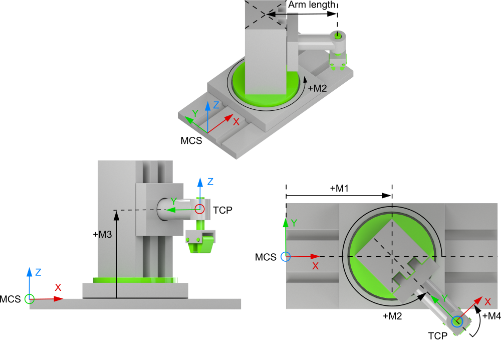 Die Motorachse M1 und M3 sind in Millimetern skaliert. In Bezug zum MCS gibt M1 eine Bewegung auf der X-Achse und M3 eine Bewegung auf der Z-Achse an. Der Ursprung des MCS-Koordinatensystems befindet sich auf der Linearachse M1 im Gelenk M2.