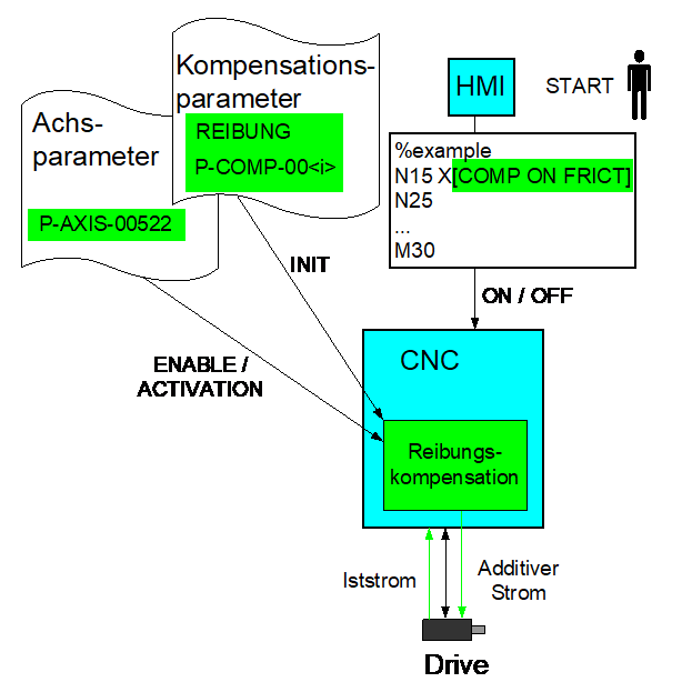 ![]() | Für die Reibungskompensation ist es grundsätzlich ausreichend, sollwertseitig einen additiven Strom an den Antrieb zu kommandieren. Um jedoch die Kennlinie für den Strom zu ermitteln und die Kompensation zu überprüfen, ist es zusätzlich erforderlich, den Iststrom auszulesen. |