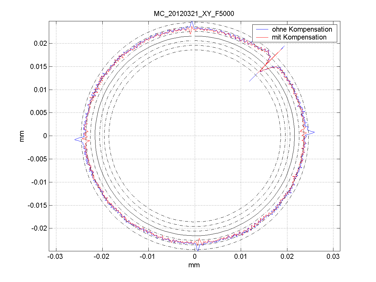 Unten stehende Abbildung zeigt das Ergebnis eines Kreisformtests mit ein- und ausgeschalteter Kompensation. Ohne Kompensation (blau) sind an den Quadrantenübergängen deutliche Peaks sichtbar, die durch die Kompensation (rot) verringert werden.