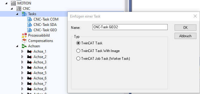 Standardmäßig wird für die CNC eine CNC-Task GEO angelegt. Um die Interpolation der einzelnen CNC-Kanäle auf unterschiedliche GEO-Tasks anlegen zu können, müssen entsprechende synchrone Tasks angelegt werden.