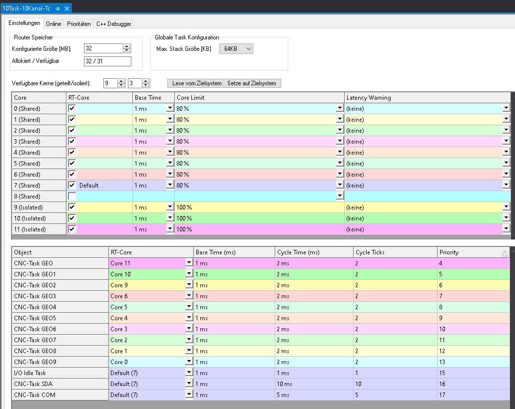 Konfiguration von 10 Kanälen (CNC-Task GEO) auf 10 CPU-Kernen