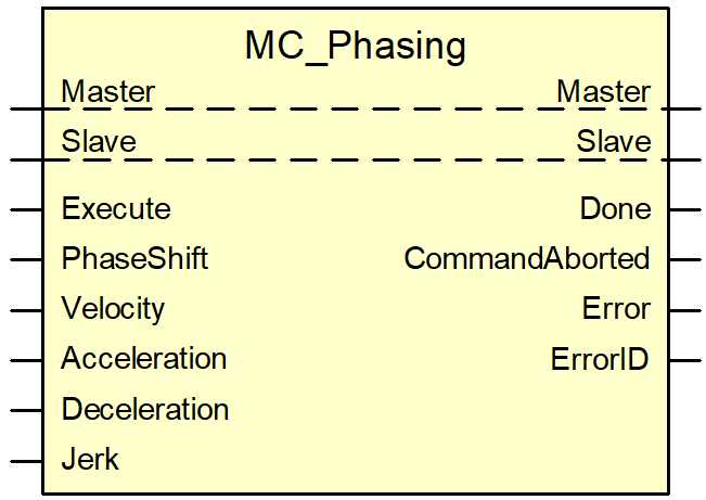 Ein MC_Phasing wird dazu benutzt, um eine Verschiebung der Slaveachse bezüglich der Masterachse zu erreichen. Dazu wird aus Sicht der Slaveachse eine Phasenverschiebung der Masterachse vorgegeben und die Slaveachse versucht durch Beschleunigung oder Verzögerung diese Verschiebung zu beseitigen. Die Bewegung wird immer ruckbegrenzt mit dem in "Jerk" eingestellten konstanten Ruck ausgeführt. Der Wert gilt sowohl für das Beschleunigen mit "Acceleration", als auch für das Bremsen mit "Deceleration".