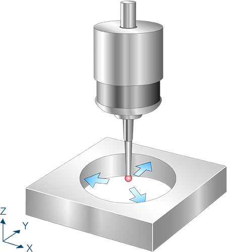 Der Messtaster misst nach der Positionierung innerhalb der Bohrung entlang von festgelegten Winkelgeraden. Der Messtaster muss manuell oder im Automatikbetrieb bestmöglich mittig auf Messtiefe in der Bohrung positioniert werden.