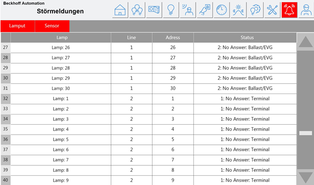 Hier werden systemrelevante Störungen gelistet. Hierzu gehören vor allem Störungen der Buskoppler, die z.B. durch einen Netzwerkausfall verursacht wurden. Ist ein Buskoppler auf Störung, werden die dort angeschlossenen Geräte nicht separat unter Leuchten/Sensoren aufgeführt.
