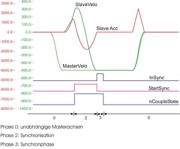 In der im Bild dargestellten Phase 0 (links) bewegen sich die beiden Achsen vollkommen unabhängig voneinander. Die zukünftige Master-Achse wird auf 500 mm/s beschleunigt und die zukünftige Slave-Achse wird auf -250 mm/s beschleunigt. In dem Phasenwechsel von 0 auf 2 wird die Synchronisation auf Geschwindigkeit der Universellen Fliegende Säge gestartet (StartSync = 1) und das Sollwertprofil zur Synchronisation berechnet. Dieses berechnete Slave-Sollwertprofil wird in der Phase 2 der Slave-Achse vorgegeben. Am Ende der Phase 2 erreicht die Slave-Achse exakt die Synchrongeschwindigkeit, welche der Geschwindigkeit der Master-Achse multipliziert mit dem Koppelfaktor entspricht. Ab diesem Zeitpunkt befinden sich die Achsen in der Synchronphase (Phase 3). In dieser Synchronphase bewegen sich beide Achsen unter Berücksichtigung des Koppelfaktors synchron. Die Synchronphase wird durch das Abkoppelkommando beendet. Dieses entspricht in dem Bild dem Übergang von der Phase 3 in die Phase 0. Ab diesem Zeitpunkt handelt es sich wieder um 2 unabhängige Masterachsen. Zum Zeitpunkt der Abkopplung erfolg eine Onlinewandlung der Slave-Achse zu einer Master-Achse. Bei dieser Onlinewandlung wird eine mögliche Beschleunigung oder Verzögerung des Slaves abgebaut und hierduch die Geschwindigkeit des ehemaligen Slaves bestimmt, mit der sich dieser endlos weiter bewegt.