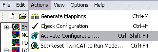 To activate the TwinCAT configuration select Ctrl+Shift+F4 or Activate Configuration.