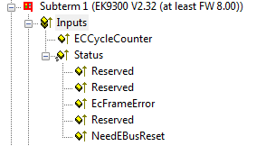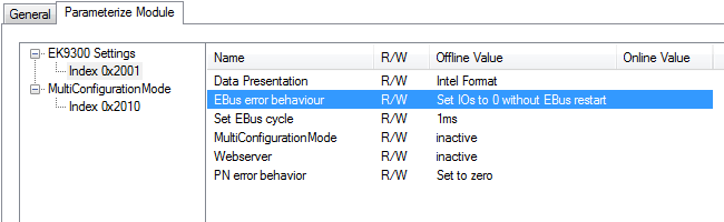 Set IOs to 0 without EBus restart | Output data is written to zero; input data is written to zero; when the E-bus is error-free, it can be activated again via the record data (see below). |