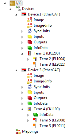 In TwinCAT, a structure can be created from the mapped process data of a terminal. An instance of this structure can then be created in the PLC, so it is possible to access the process data directly from the PLC without having to declare own variables.