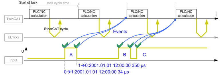 - Sampling of the input state 0/1 takes place based on a microcycle of several µs, depending on the selected setting, i.e. significantly faster than the EtherCAT bus cycle time