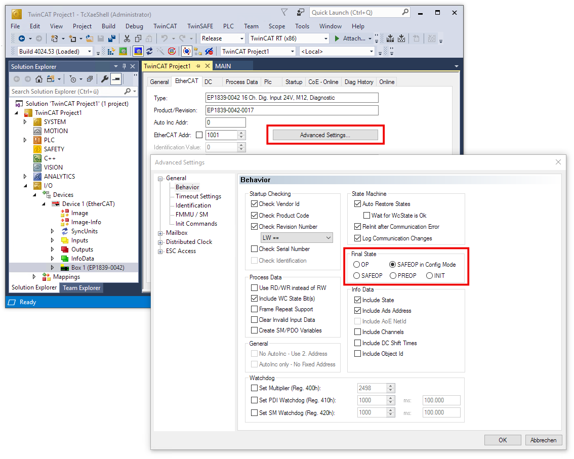 Ex factory, the box is configured so that it automatically switches to "Safe-Operational" status when operating in Config Mode. In this state, all switchable outputs are in the safe state, i.e. switched off.