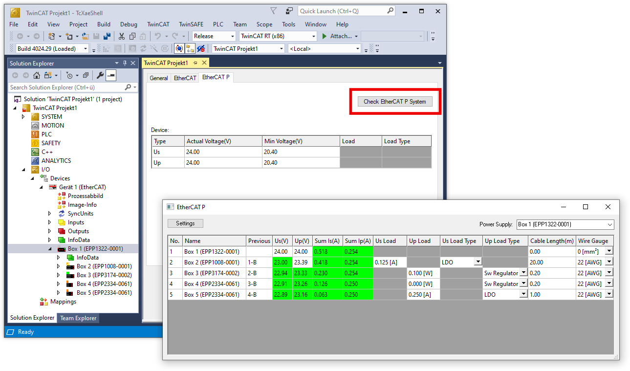 You can plan cable lengths, voltages and currents of your EtherCAT P system using TwinCAT 3. The requirement for this is TwinCAT 3 Build 4020 or higher.