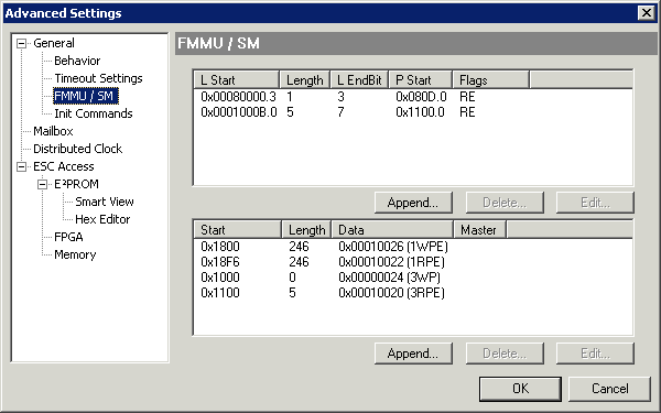 This dialog shows the current configuration of the Fieldbus Memory Management Unit (FMMU) and the Sync Managers (SM) and enables you to modify them.