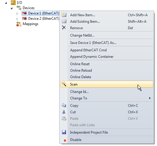 In the project folder explorer on the left of the Visual Studio shell user interface, select “Devices” within the element “I/O”, then right-click to open a context menu and select “Scan” or start the action via