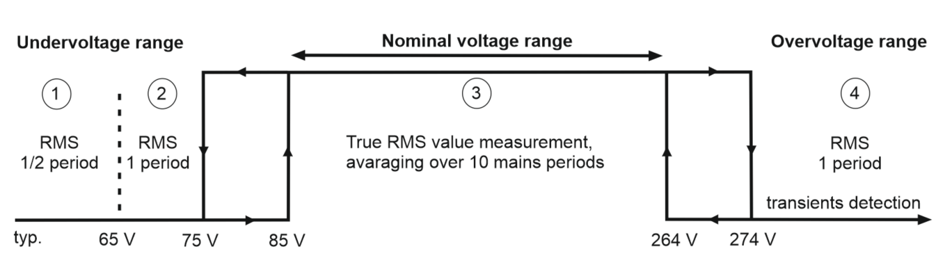 The AC input voltage is determined with an effective power measurement. In the nominal voltage range of 85 - 264 V AC, an average value is calculated over 10 mains periods.