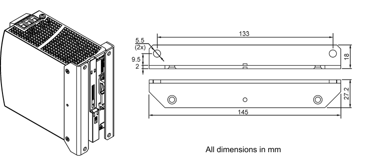 This bracket is used to mount the device on a level surface or panel without the use of a DIN rail. The bracket can be mounted without loosening the DIN rail brackets.
