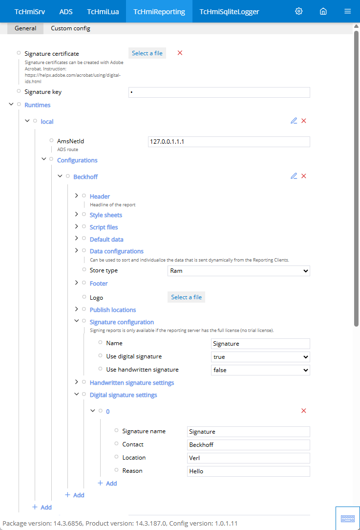 ![]() | Adding a digital signature is only possible with a full license of the Reporting Server. This is integrated in the TF2000 TwinCAT HMI Server license. |