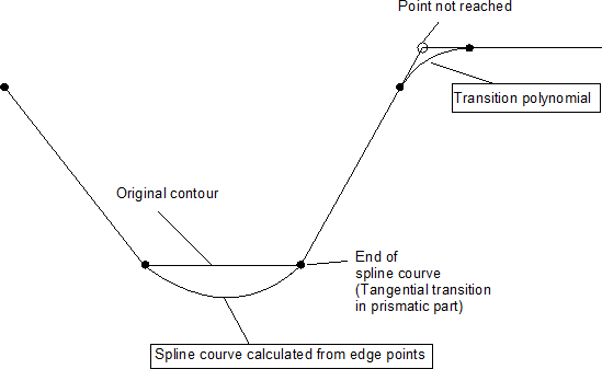 In operation mode 2, spline curves are generated by the specified edge points. At the start of prismatic parts, spline generation is automatically deselected and a tangential transition is executed.
