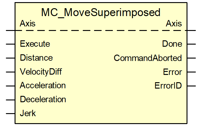 MC_MoveSuperImposed commands a relative motion in addition to a motion already active. The active motion is not interrupted but is superimposed over the commanded one. The motion is always executed jerk-limited at the constant set in "Jerk”. This value is valid for both "Acceleration" and "Deceleration".