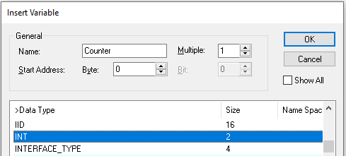 - 13. Set a name for the process variable, e.g. Counter and select INT as the Datatype. Click on Ok to add the variable to the process image of the Dataset.