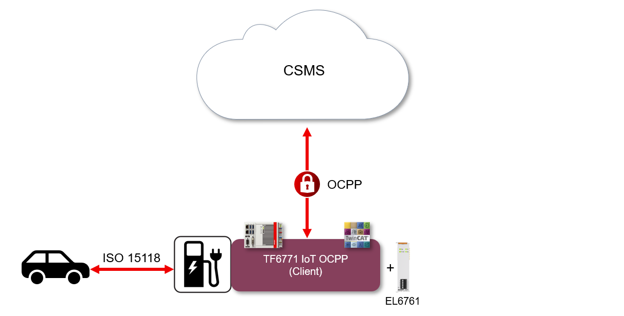 On the software side, the Charging Station automated with TwinCAT is connected to a CSMS as an OCPP client. Communication in the direction of the vehicle to be charged is realized via the EL6761.