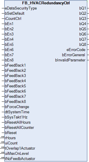 bReset : BOOL;eDataSecurityType: If eDataSecurityType:= eHVACDataSecurityType_Persistent, the persistent VAR_IN_OUT variables of the function block are stored in the flash of the computer if a value changes. For this to work, the function block FB_HVACPersistentDataHandling must be instanced once in the main program, which is called cyclically. Otherwise the instanced FB is not released internally.