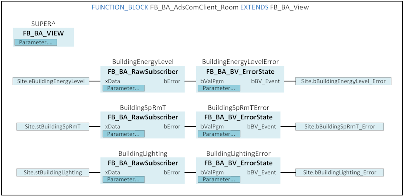 BuildingSpRmT | The subscriber accesses the TwinCAT network structure BuildingSpRmT and saves the data in the created structure stBuildingSpRmT of the GVL Site. | |